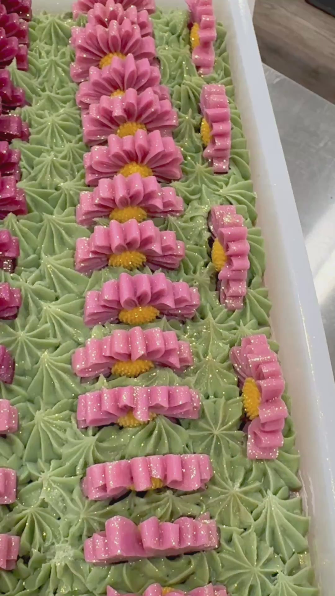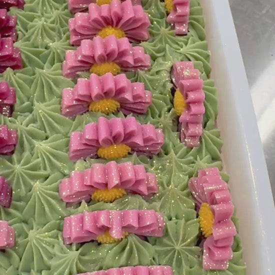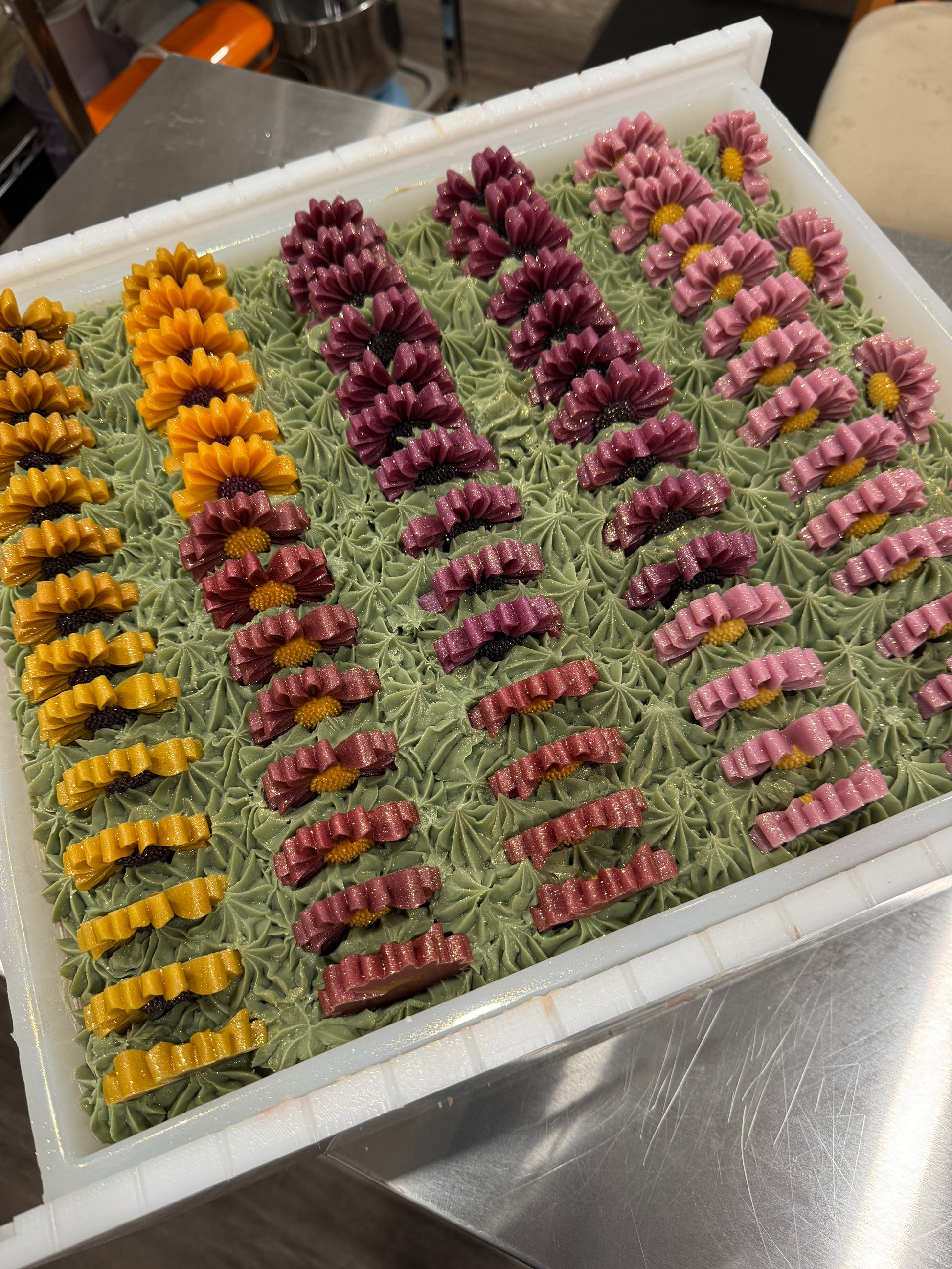 Beurre de karité ECOCERT, Huile de canola, Eau, Huile de tournesol, Huile de coco BIO, Hydroxyde de sodium, Huile de ricin, Beurre de cacao, Huile de palmiste RSPO, Lait de coco BIO, Lactate de sodium, Soie, Argile blanche, Décoration en savon à la glycérine (chrysanthème), Colorants sécuritaires pour cosmétiques, Parfum.