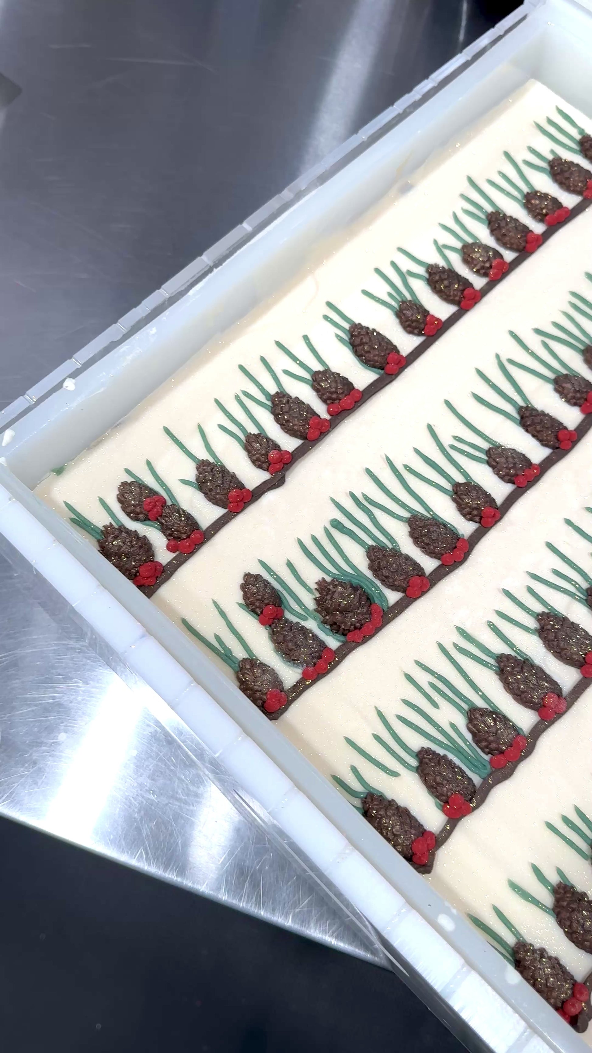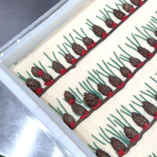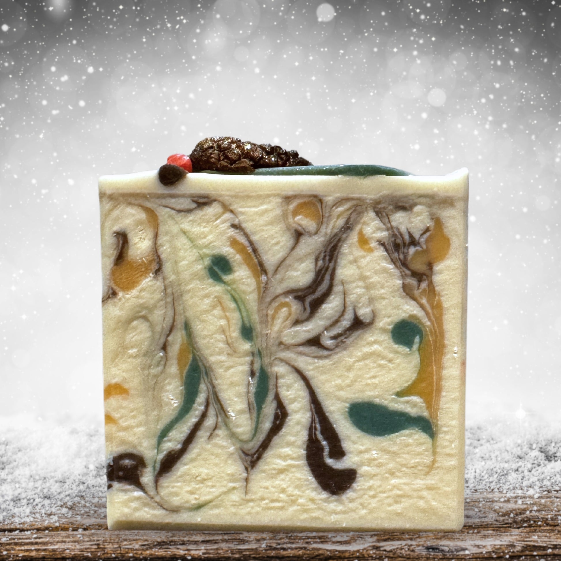 Ce savon est enrichi de soie et de lait de coco pour une expérience luxueuse. Il est décoré avec des aiguilles de pin et des petits fruits réalisés à l'aide d'une poche à douille, ainsi que d'une cocotte en savon à la glycérine.