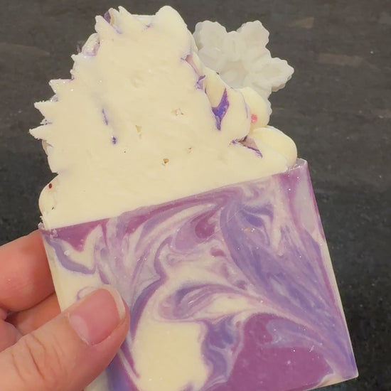 Le dessus du savon est façonné à l'aide d'une poche à douille, un peu comme on ferait avec du crémage à gâteau. Il est décoré d'un flocon fait en savon à la glycérine, de coulis de mica, ainsi que de paillettes biodégradables.