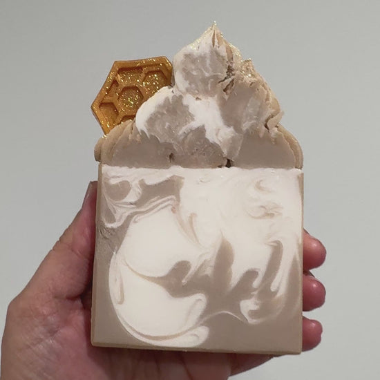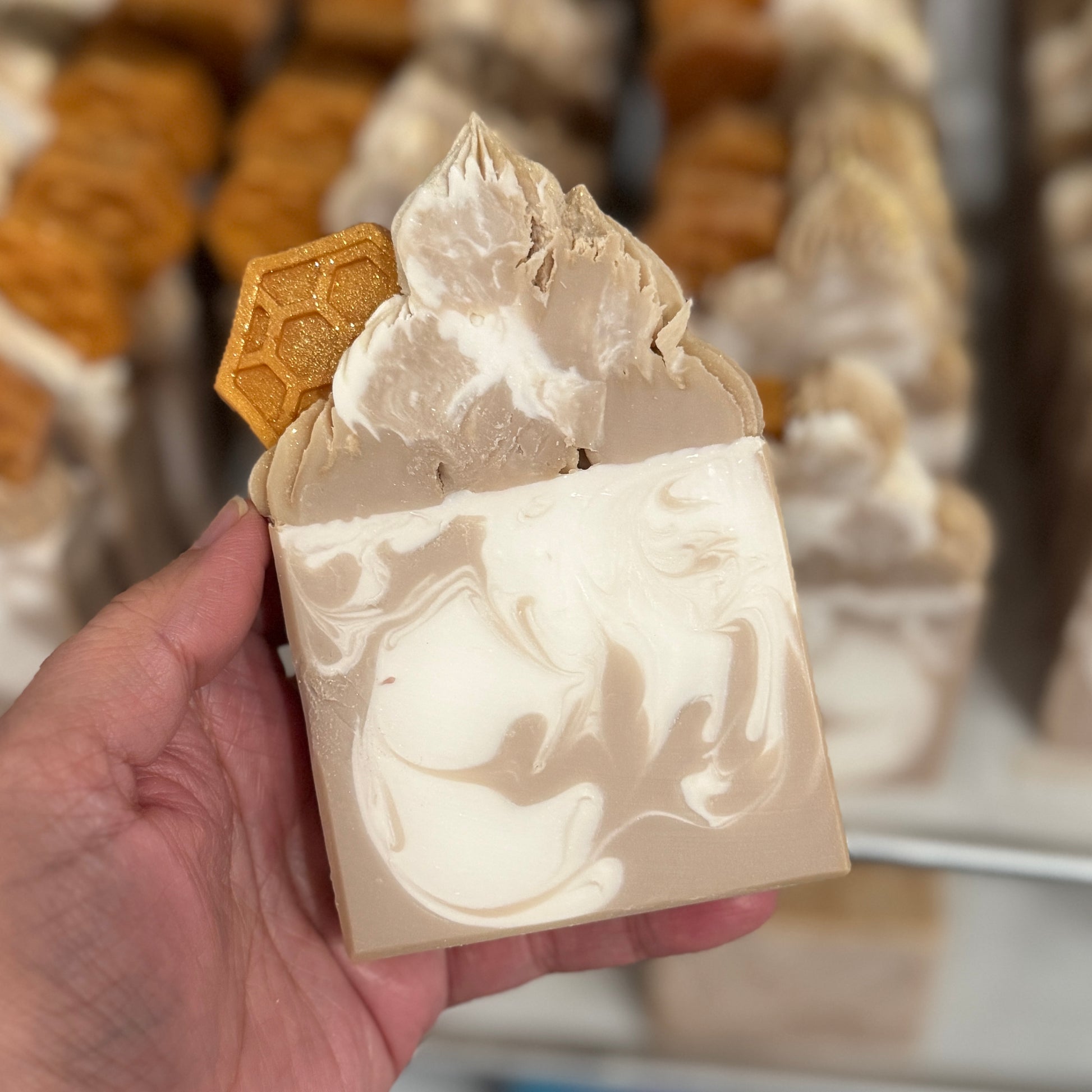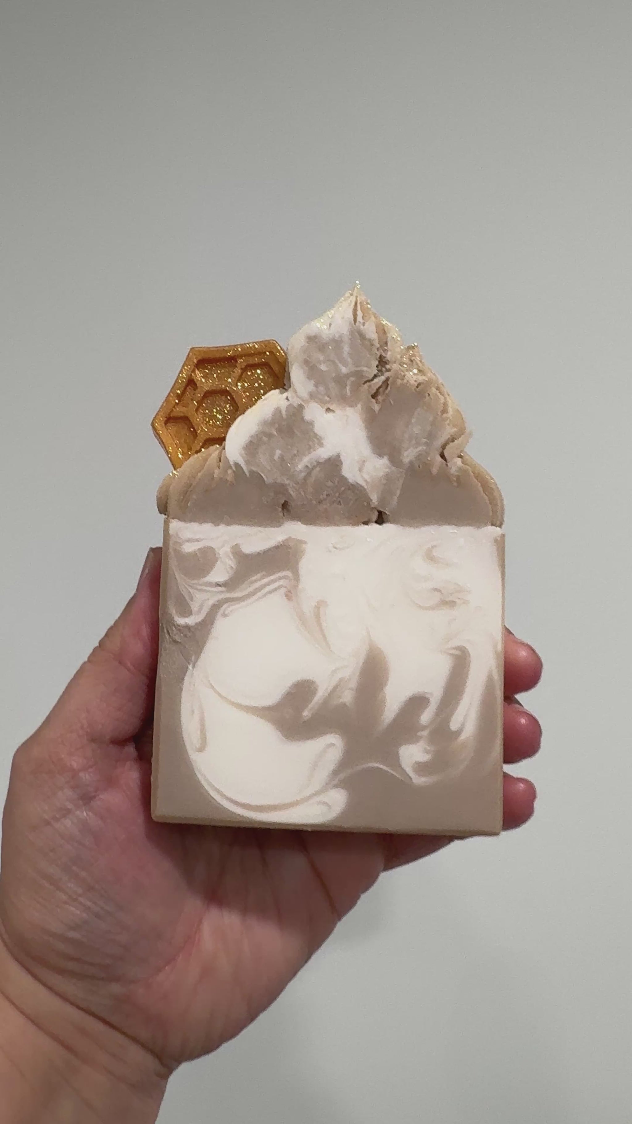 Beurre de karité ECOCERT, Huile de canola, Eau, Huile de tournesol, Huile de coco BIO, Hydroxyde de sodium, Huile de ricin, Beurre de cacao, Huile de palmiste RSPO, Lait de coco BIO, Lactate de sodium, Avoine colloïdale, Soie, Décoration en savon à la glycérine (nid d'abeille), Colorants sécuritaires pour cosmétiques, Parfum.