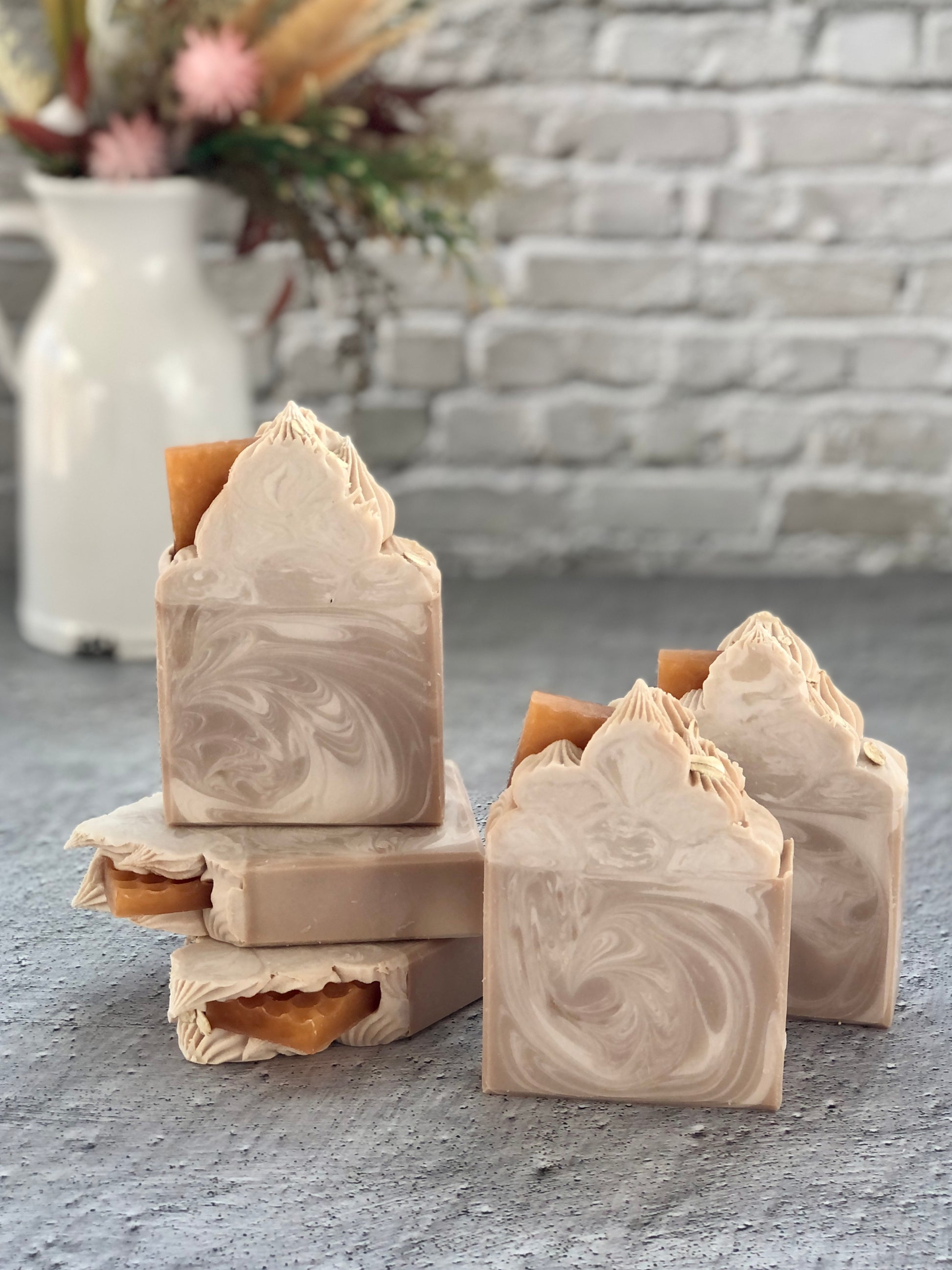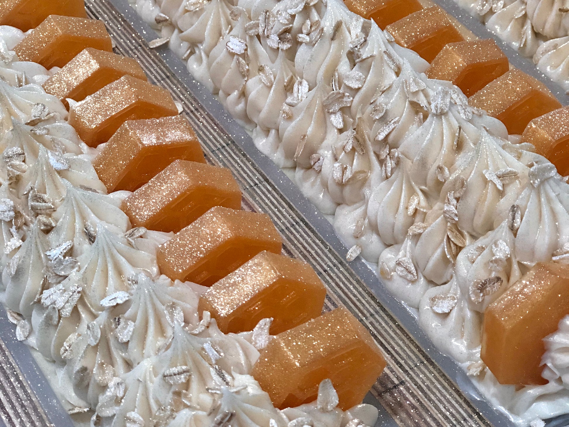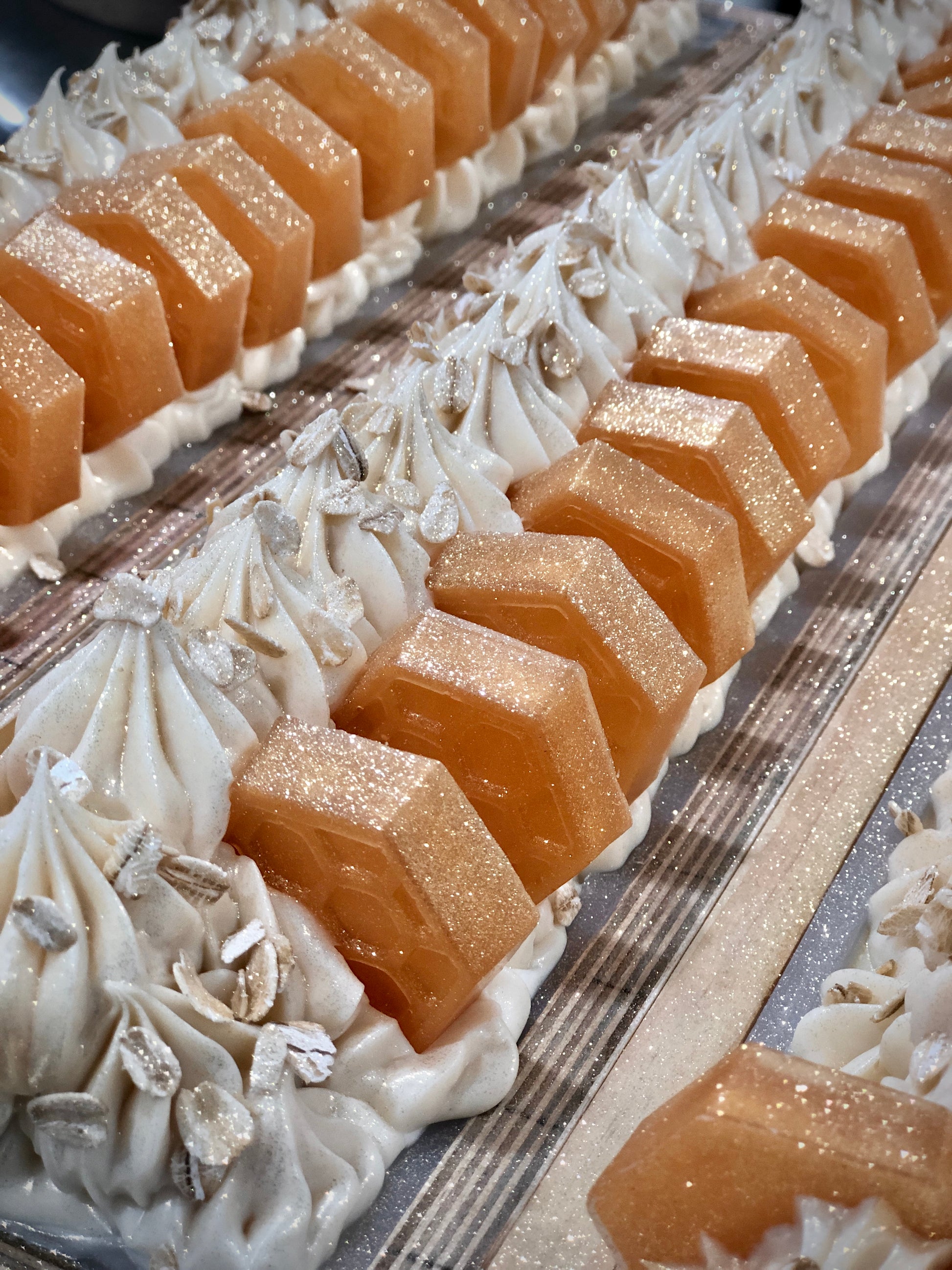 Beurre de karité ECOCERT, Huile de canola, Eau, Huile de tournesol, Huile de coco BIO, Hydroxyde de sodium, Huile de ricin, Beurre de cacao, Huile de palmiste RSPO, Lait de coco BIO, Lactate de sodium, Avoine colloïdale, Soie, Décoration en savon à la glycérine (nid d'abeille), Colorants sécuritaires pour cosmétiques, Parfum.
