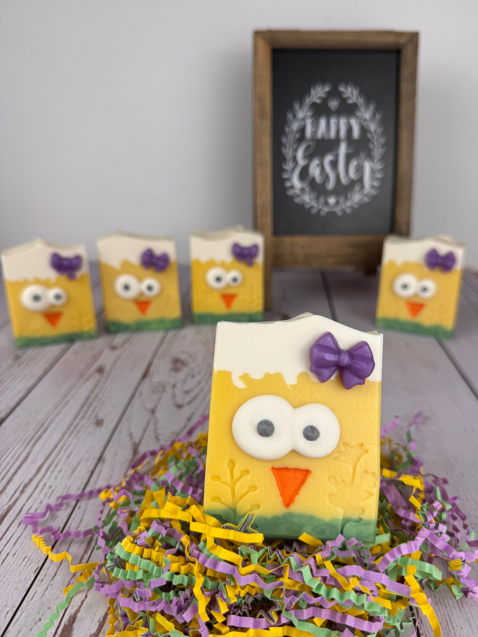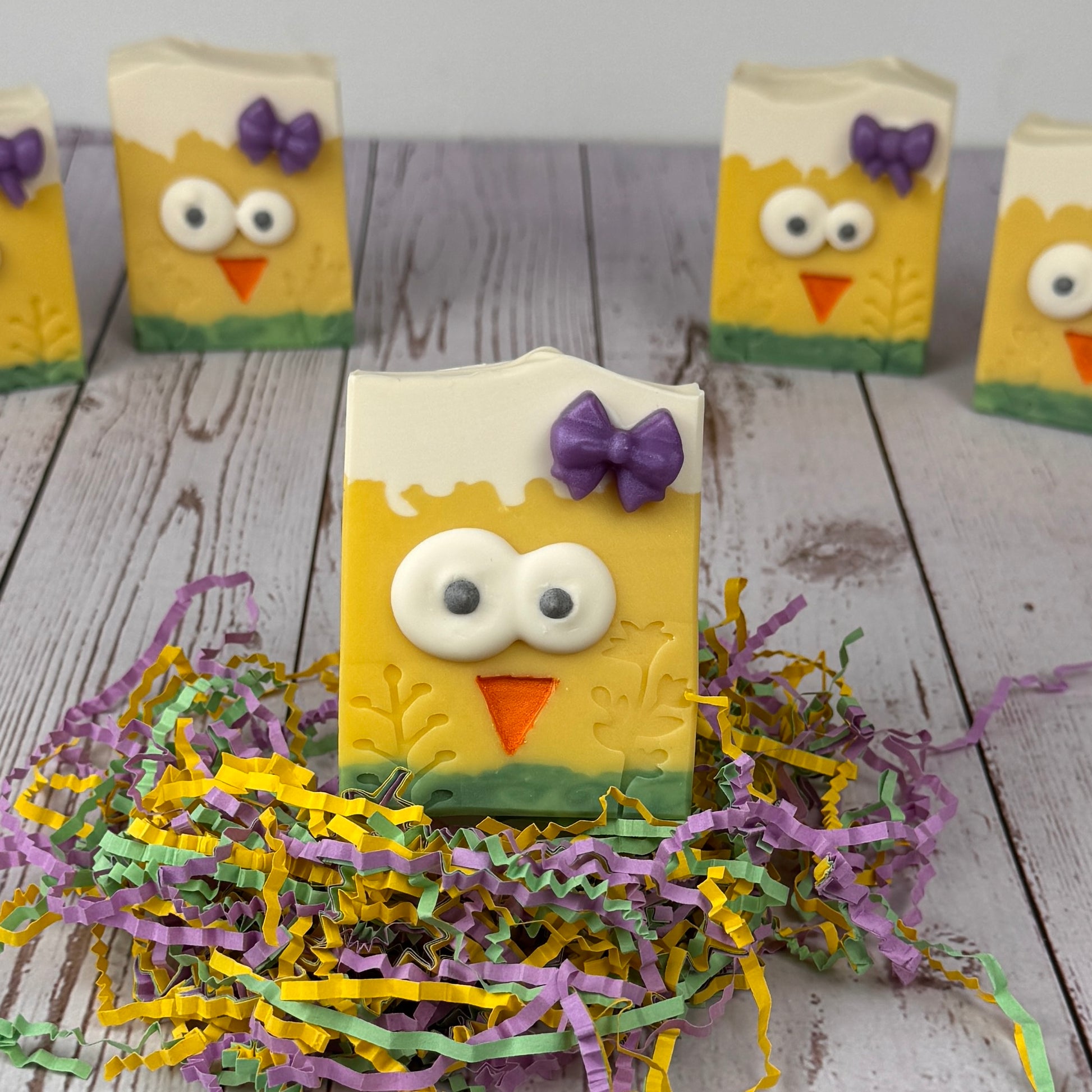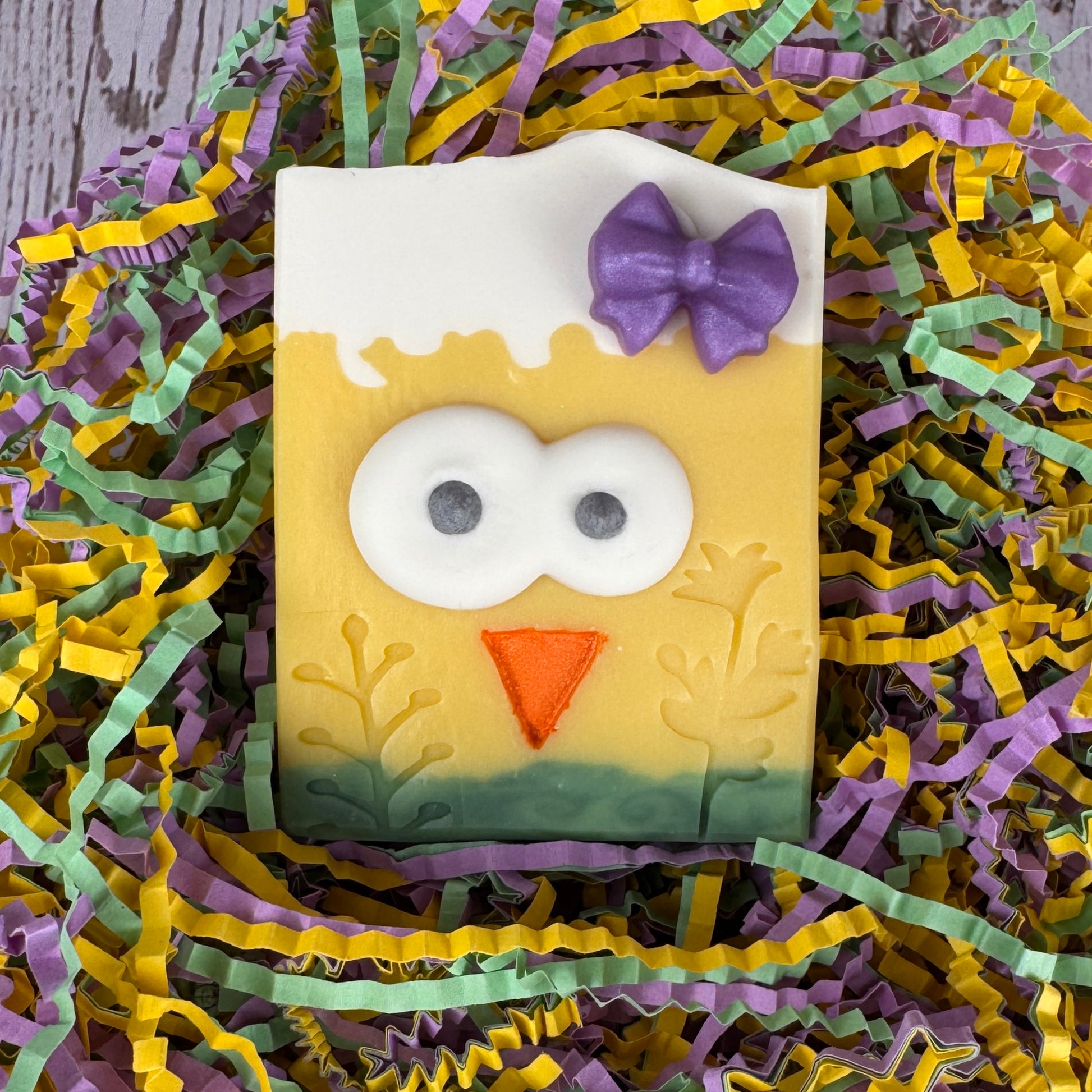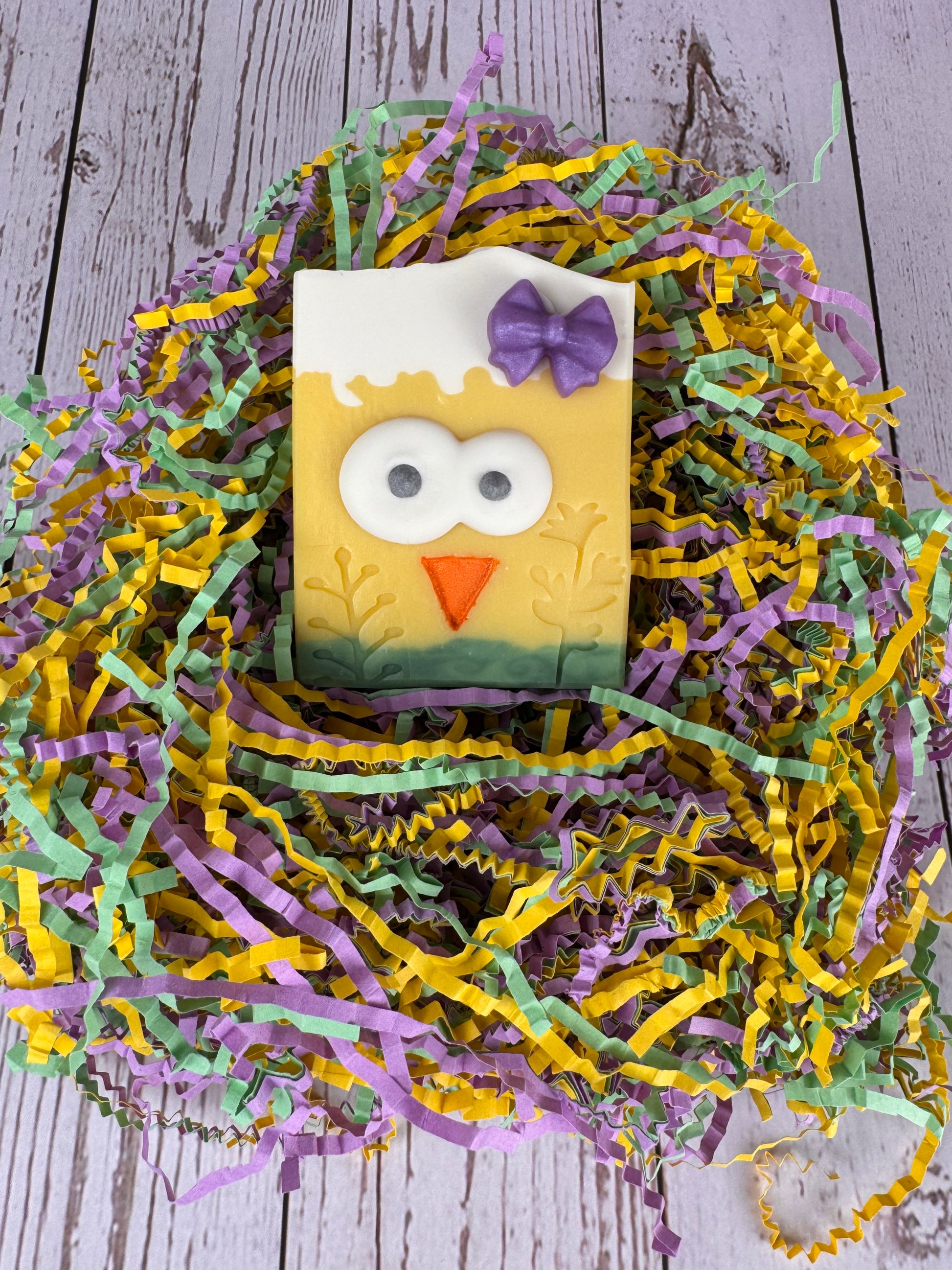 Les yeux sont faits à la main à la poche à douille. Le bec et les fleurs sont étampées à la main aussi. BEAUCOUP d'amour a été mis dans ce savon!